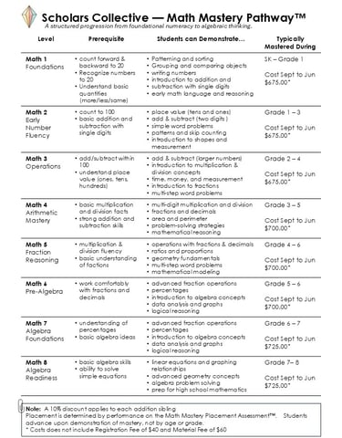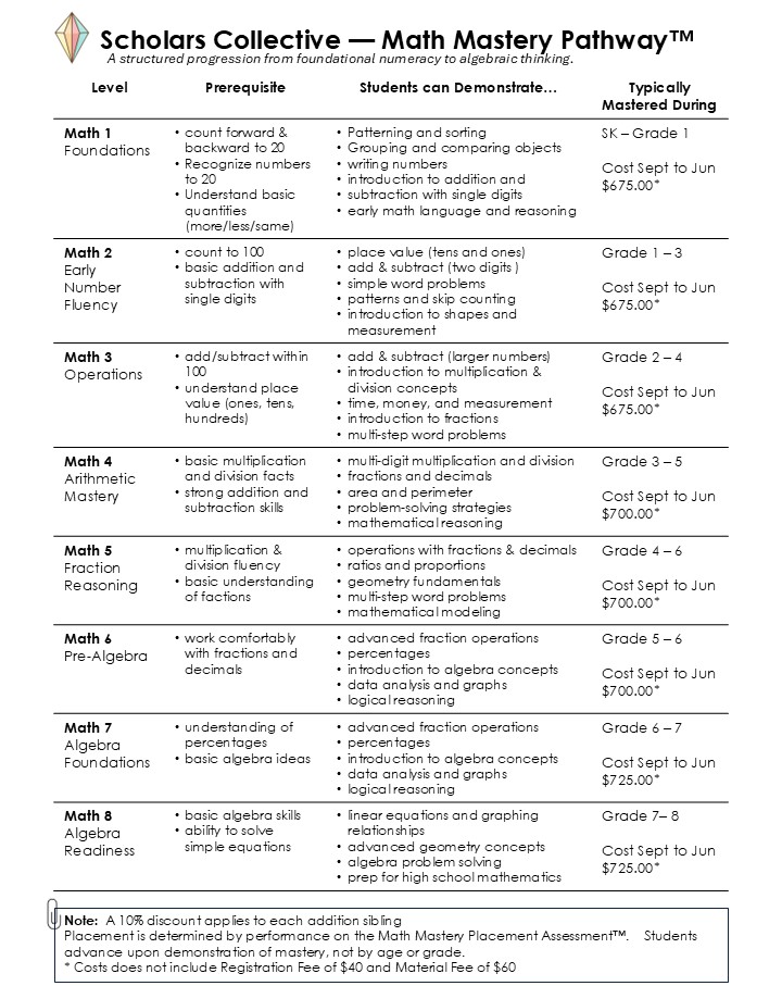 Use the provided chart to choose the Math class that fits your child’s abilities.